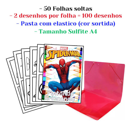 Um kit econômico e divertido com 100 desenhos do Homem-Aranha (Spider-Man), organizados em 2 por página, totalizando 50 folhas A4. Impressos em papel sulfite 75g de alta qualidade – ideais para lápis de cor, giz de cera e canetinha, sem borrar.