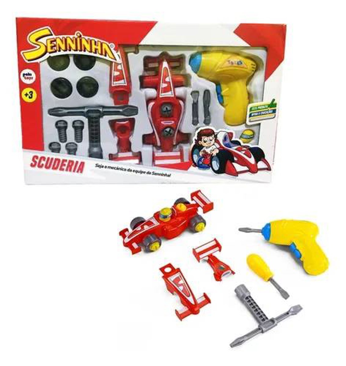 O Kit de Ferramentas Infantil Senninha – Scuderia (21 peças) é um brinquedo educativo inspirado no universo automobilístico, ideal para crianças a partir de 3 anos. Composto por 21 peças coloridas e fáceis de montar, o kit permite que a criança construa, desmonte e remonte um carrinho de corrida estilo Fórmula 1, usando ferramentas de brinquedo como chave de fenda e chave inglesa. Esse conjunto estimula a coordenação motora, raciocínio lógico, criatividade e habilidades manuais, enquanto a criança se diverte imitando as atividades de um verdadeiro mecânico de garagem. As peças são feitas em plástico resistente e seguro, com design atrativo e cores vibrantes da temática Scuderia Senninha. Ideal para brincadeiras em casa e momentos de interação familiar, esse kit combina diversão com aprendizado, ajudando no desenvolvimento das habilidades motoras e cognitivas dos pequenos.