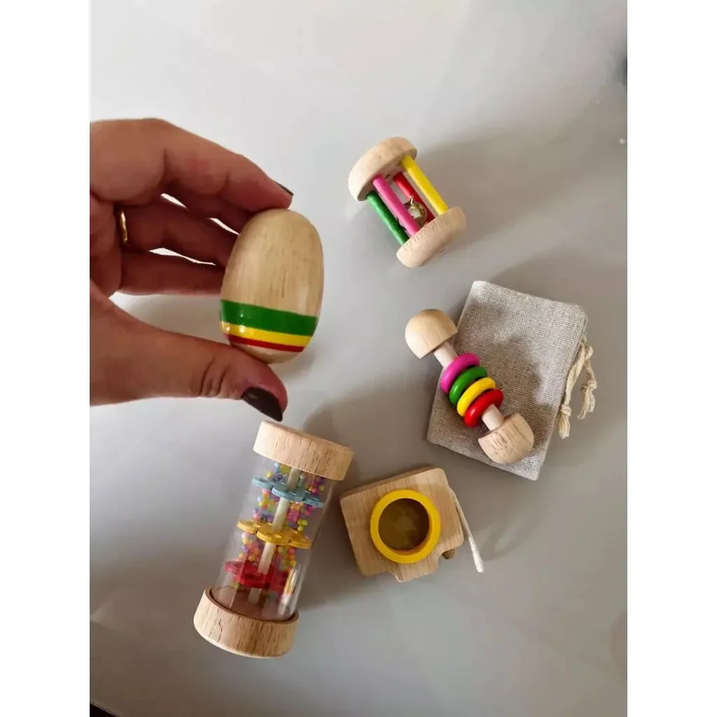 Chocalho Para Bebê Madeira Sensorial +5 Meses Kit 6pçs