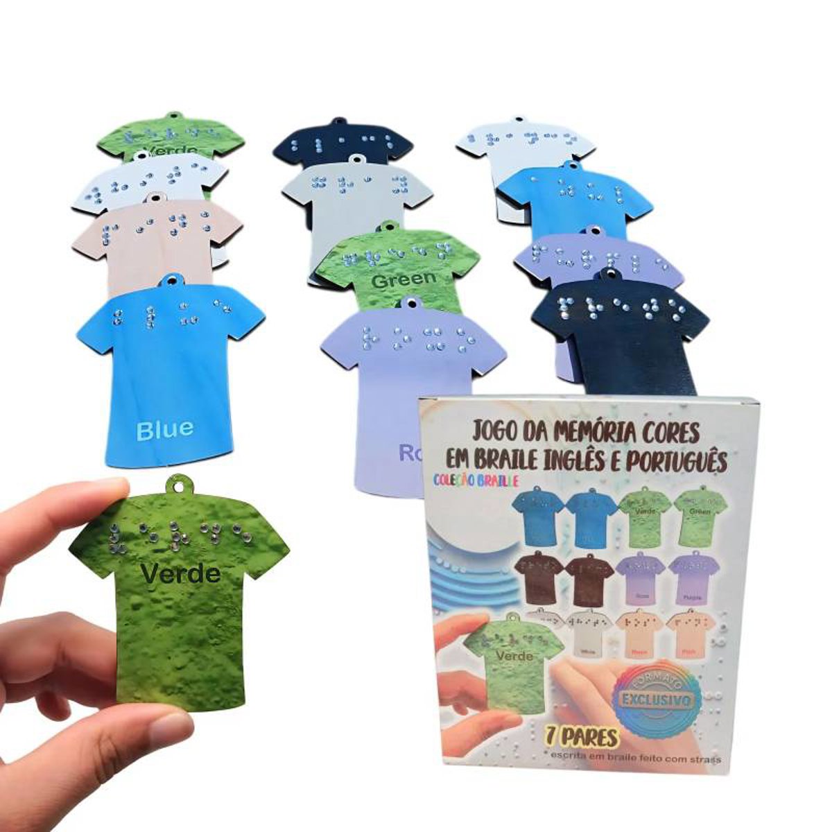 NOVODescubra o divertido Jogo da Memória da Junges, que vem com várias peças feitas de madeira sustentável. As imagens são impressas diretamente na madeira, garantindo um visual super bacana e uma durabilidade que dá gosto de ver. Esse jogo transforma a diversão em aprendizado, ajudando a desenvolver o raciocínio lógico, a concentração e a atenção de forma alegre e descontraída. É perfeito para crianças a partir de cinco anos!Jogo da Memória Educativo Aprendendo Ingles em Braille 7 pares Descubra o Jogo da Memória Educativo Aprendendo Ingles em Braille 7 pares, um jogo de memória inclusivo e educativo com 7 pares de camisetas coloridas. Cada peça traz o nome da cor em dois idiomas, português e inglês, com escrita em braille detalhada com strass, promovendo a acessibilidade tátil e visual. Ideal para crianças e adultos, estimula a percepção sensorial, o aprendizado bilíngue e a memória. - 7 pares de camisetas em cores variadas e contrastantes - Texto em português e inglês para ampliar o vocabulário - Escrita em braille em strass para leitura tátil e acessibilidade - Material resistente e acabamento de alta qualidade - Estimula cognição, linguagem e inclusão social Transforme o aprendizado em diversão enquanto desenvolve habilidades essenciais com este jogo único e comprovadamente eficaz em ambientes escolares e familiares. Aumente a interação e conscientização sobre a diversidade sensorial. Características do Prouduto: Quantidade de peças : 14 peças ( 7 pares) Escrita em Braille feita com strass termocolante resistente