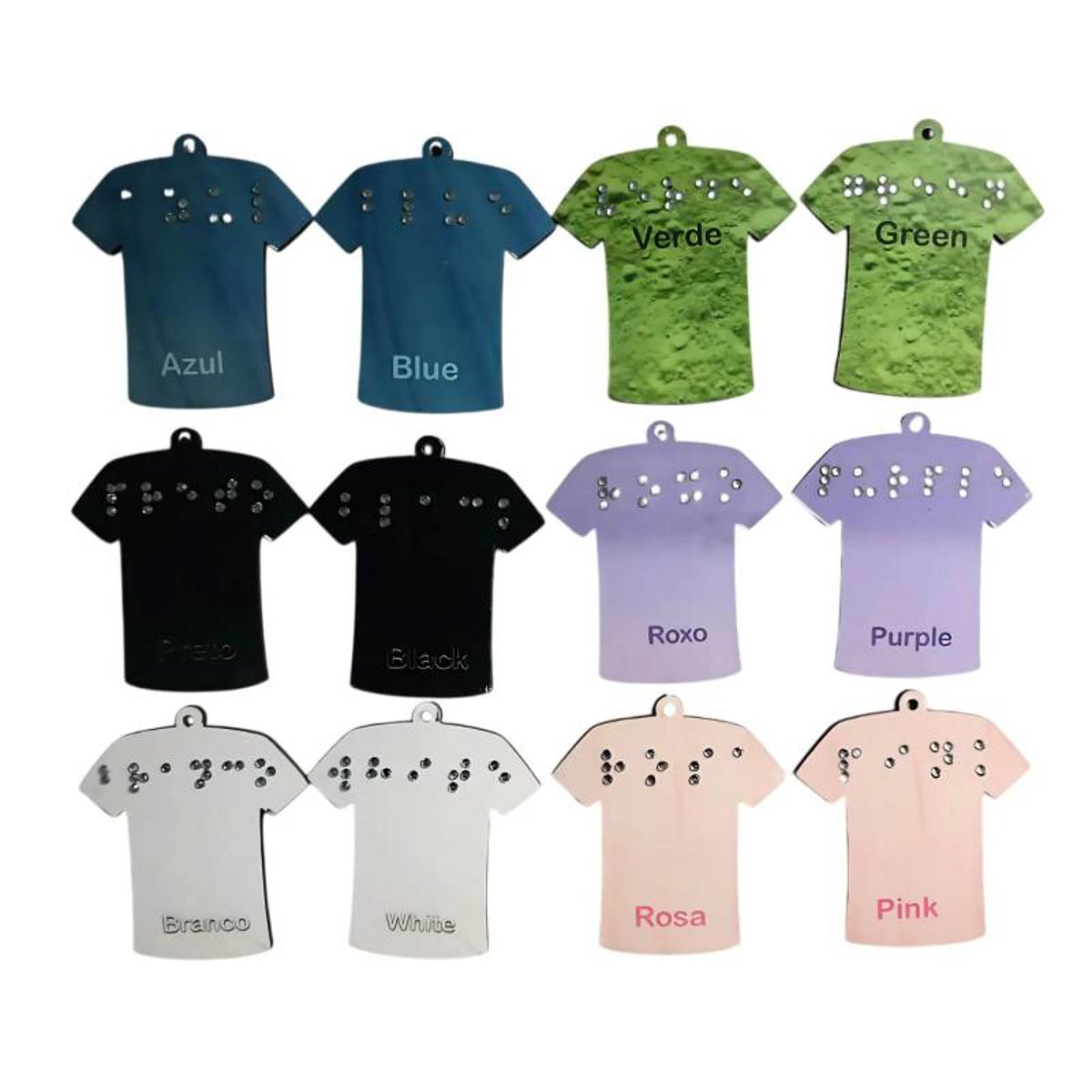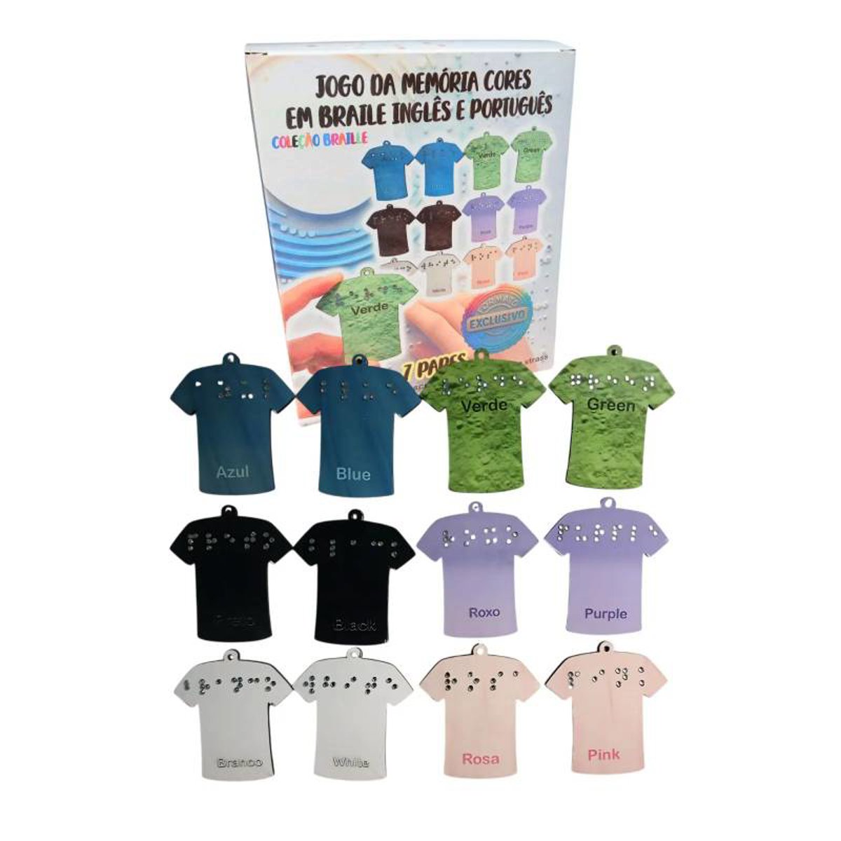 NOVOJogo da Memória Educativo Aprendendo Ingles em Braille 7 pares Descubra o Jogo da Memória Educativo Aprendendo Ingles em Braille 7 pares, um jogo de memória inclusivo e educativo com 7 pares de camisetas coloridas. Cada peça traz o nome da cor em dois idiomas, português e inglês, com escrita em braille detalhada com strass, promovendo a acessibilidade tátil e visual. Ideal para crianças e adultos, estimula a percepção sensorial, o aprendizado bilíngue e a memória. - 7 pares de camisetas em cores variadas e contrastantes - Texto em português e inglês para ampliar o vocabulário - Escrita em braille em strass para leitura tátil e acessibilidade - Material resistente e acabamento de alta qualidade - Estimula cognição, linguagem e inclusão social Transforme o aprendizado em diversão enquanto desenvolve habilidades essenciais com este jogo único e comprovadamente eficaz em ambientes escolares e familiares. Aumente a interação e conscientização sobre a diversidade sensorial. Características do Prouduto: Quantidade de peças : 14 peças ( 7 pares) Escrita em Braille feita com strass termocolante resistente