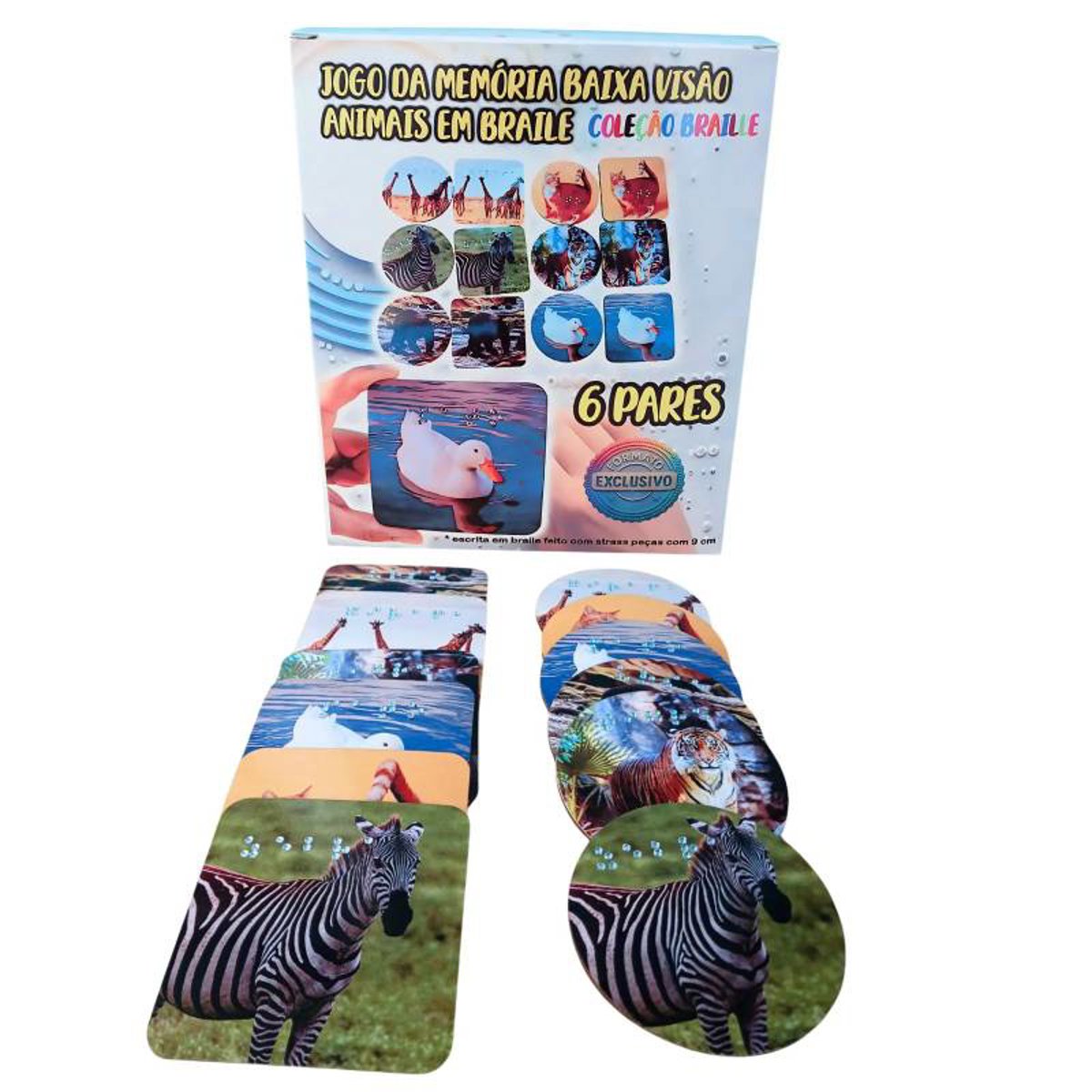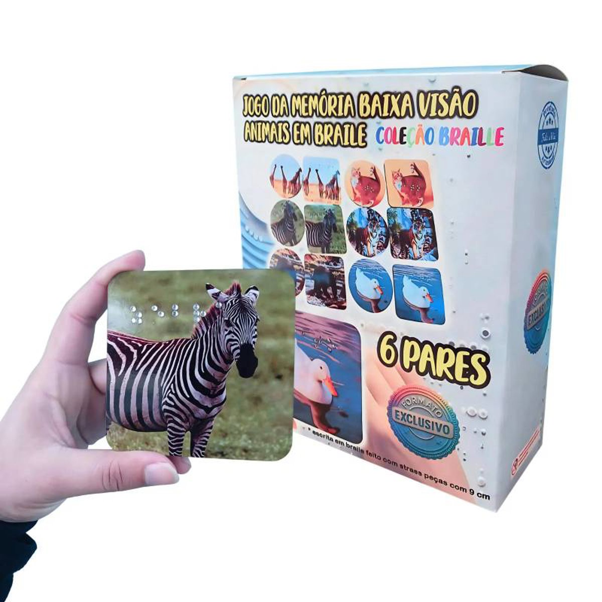 NOVOJogo Educacional Braille para Crianças com Baixa Visão 6 Pares Desenvolva habilidades cognitivas e sensoriais com o Jogo Educacional Braille para Crianças com Baixa Visão 6 Pares, ideal para crianças e adultos com baixa visão. Este jogo da memória exclusivo combina imagens nítidas de animais com a escrita em Braille, facilitando a aprendizagem tátil e visual de forma lúdica e inclusiva. Estimule a memória, a concentração e o vocabulário enquanto promove a inclusão social. Um recurso essencial para educadores e famílias que buscam educação acessível e divertida. Um excelente material didático que une diversão e acessibilidade, contribuindo para a autonomia e a inclusão social de crianças com necessidades visuais específicas. Aposte em um brinquedo que ensina, acolhe e transforma. Principais atributos: - 6 pares de peças com imagens de animais e escrita em Braille feita com strass termocolante. - Peças com 9 cm, dois formatos exclusivos para melhor percepção tátil - Promove inclusão e acessibilidade para pessoas com baixa visão - Estimula memória, atenção e aprendizagem sensorial - Material resistente e adequado para uso escolar e doméstico. Características do Produto: Material : MDF Escrita feita com strass termocolante Quantidade de peças: 12 peças ( 6 pares)