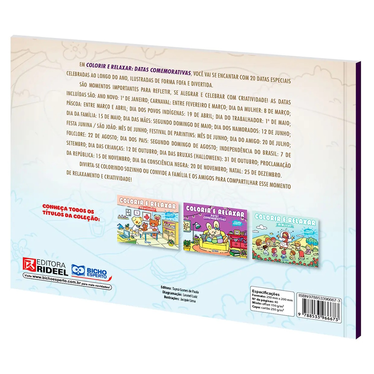 Uma experiência divertida e relaxante, perfeita para estimular a criatividade e o foco das crianças e adultos! O livro Colorir e Relaxar oferece uma combinação única de atividades de colorir inspiradas em datas comemorativas, ilustrações encantadoras e educativas. Feito com papel de alta gramatura e uma lâmina de acetato para evitar transferências de tinta, ele é ideal para quem busca um momento de descontração e lazer.