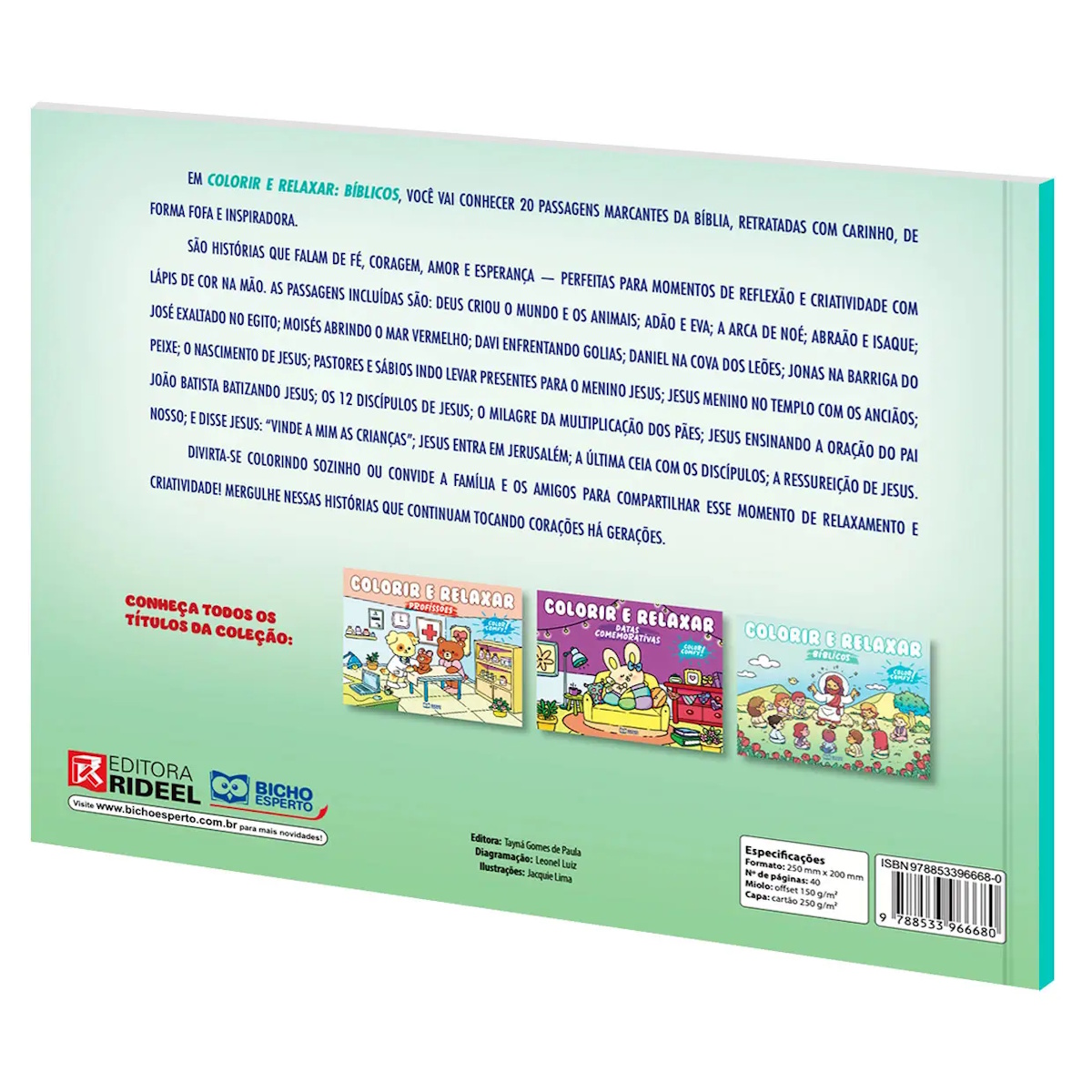 Uma experiência divertida e relaxante, perfeita para estimular a criatividade e o foco das crianças e adultos! O livro Colorir e Relaxar oferece uma combinação única de atividades de colorir inspiradas em histórias bíblicas, ilustrações encantadoras e educativas. Feito com papel de alta gramatura e uma lâmina de acetato para evitar transferências de tinta, ele é ideal para quem busca um momento de descontração e lazer.