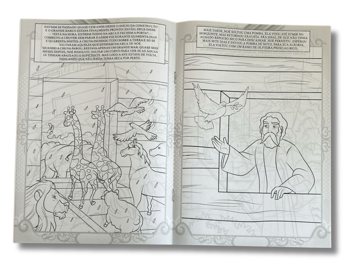 O livro conta, de maneira simples e ilustrada, a história de Noé e do grande dilúvio. As crianças acompanham como Deus pediu a Noé que construísse uma arca para salvar sua família e os animais, e como todos foram protegidos durante a chuva que cobriu a terra. Com páginas para ler e colorir, o livro ajuda os pequenos a entender valores como obediência, fé e cuidado com a criação, tornando o aprendizado leve e divertido.