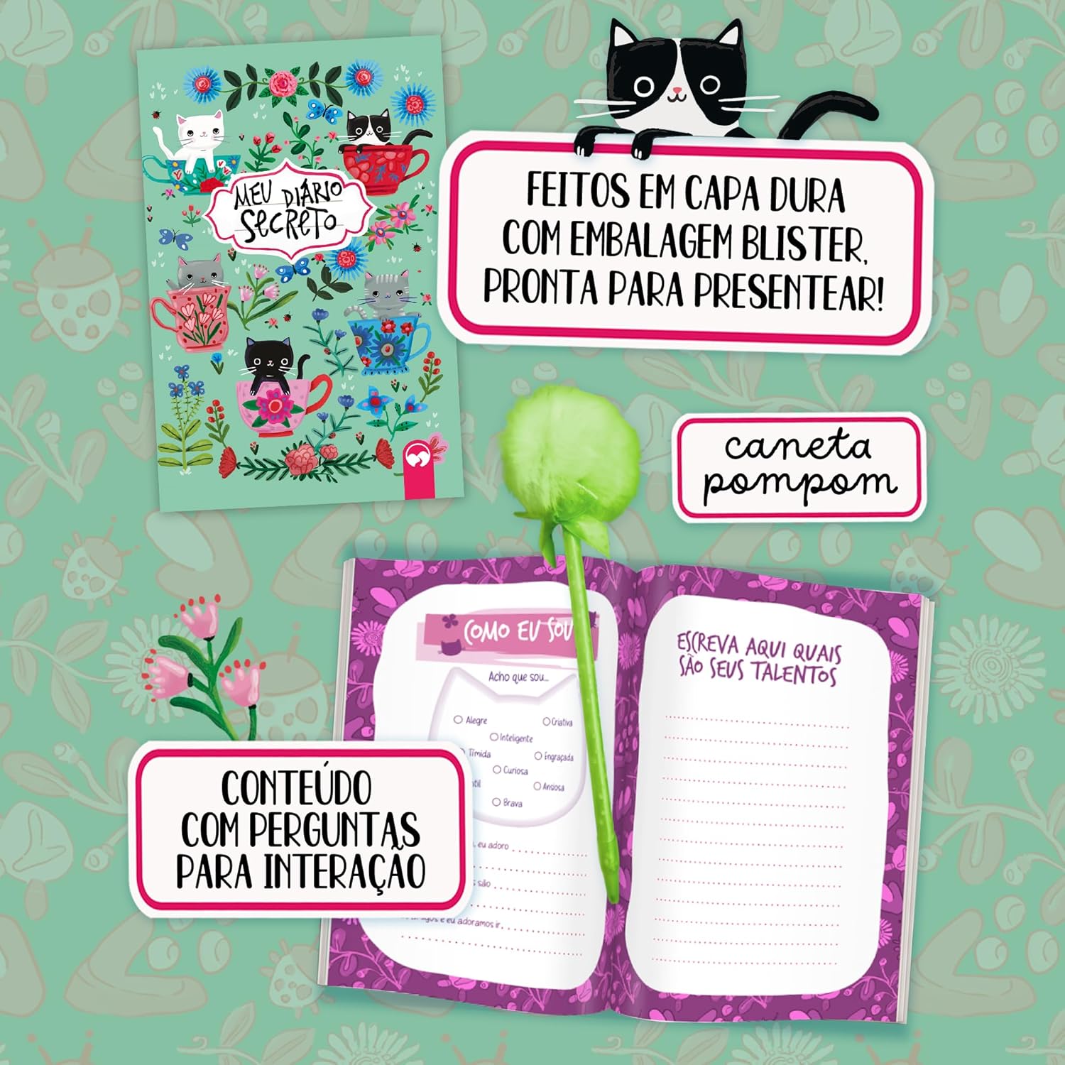 LIVRO MEU DIÁRIO SECRETO COM CANETA POMPOM - GATINHAS CURIOSAS